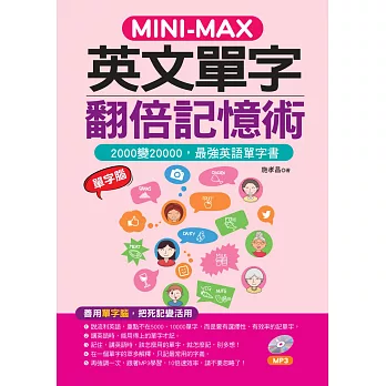 MINI—MAX 英文單字翻倍記憶術:善用單字腦,2000變20000 (附MP3)購買網址:http://www.books.com.tw/exep/assp.php/87926/products/0010699881?utm_source=87926&utm_medium=ap-books&utm_content=recommend&utm_campaign=ap-201706